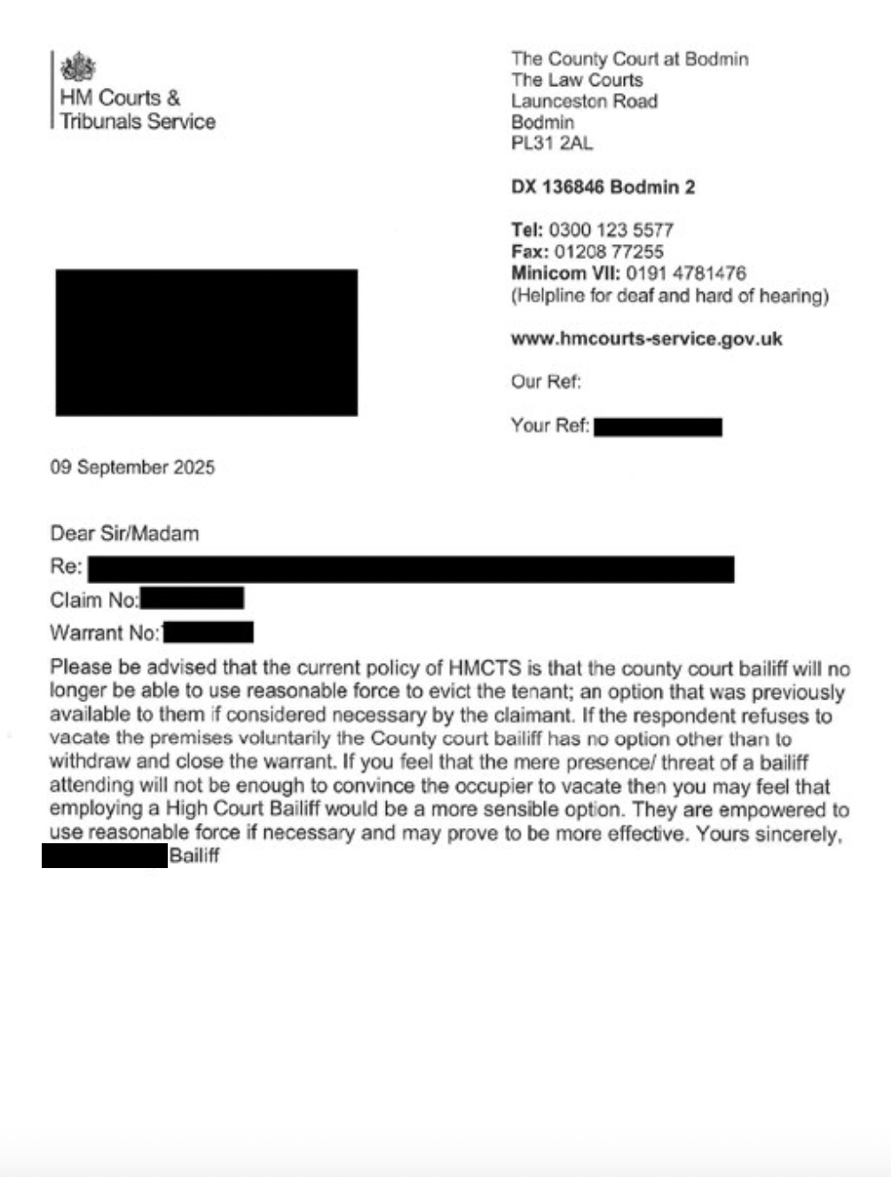 At least one County Court is now quoting HMCTS policy as stating that “the county court bailiff will no longer be able to use reasonable force to evict the tenant” where necessary and recommending the use of High Court enforcement if appropriate. This new policy will inevitably cause further delays.