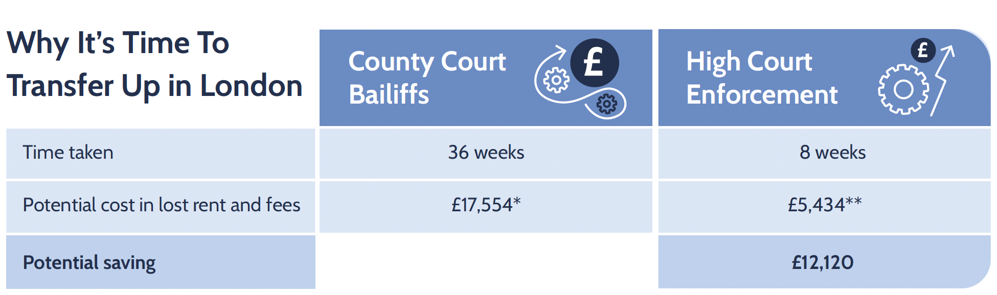 Using the High Court Enforcement route the average saving per property in London could be around £12,000 even once High Court fees are taken into account.